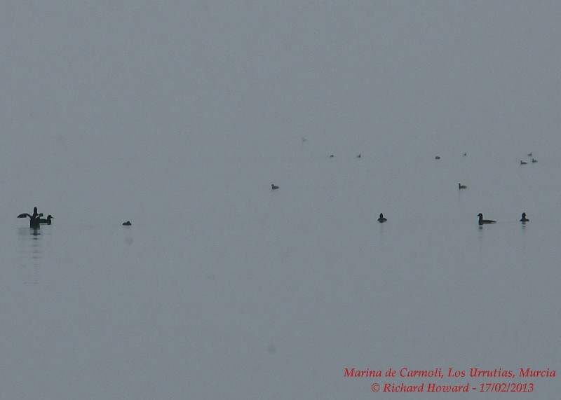 Record shot of Common Scoter seen in the mist - their facial pattern is just about viewable